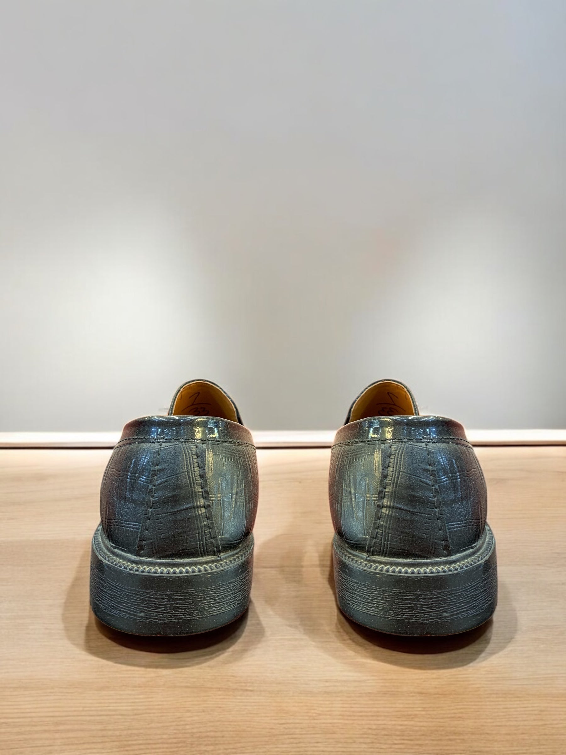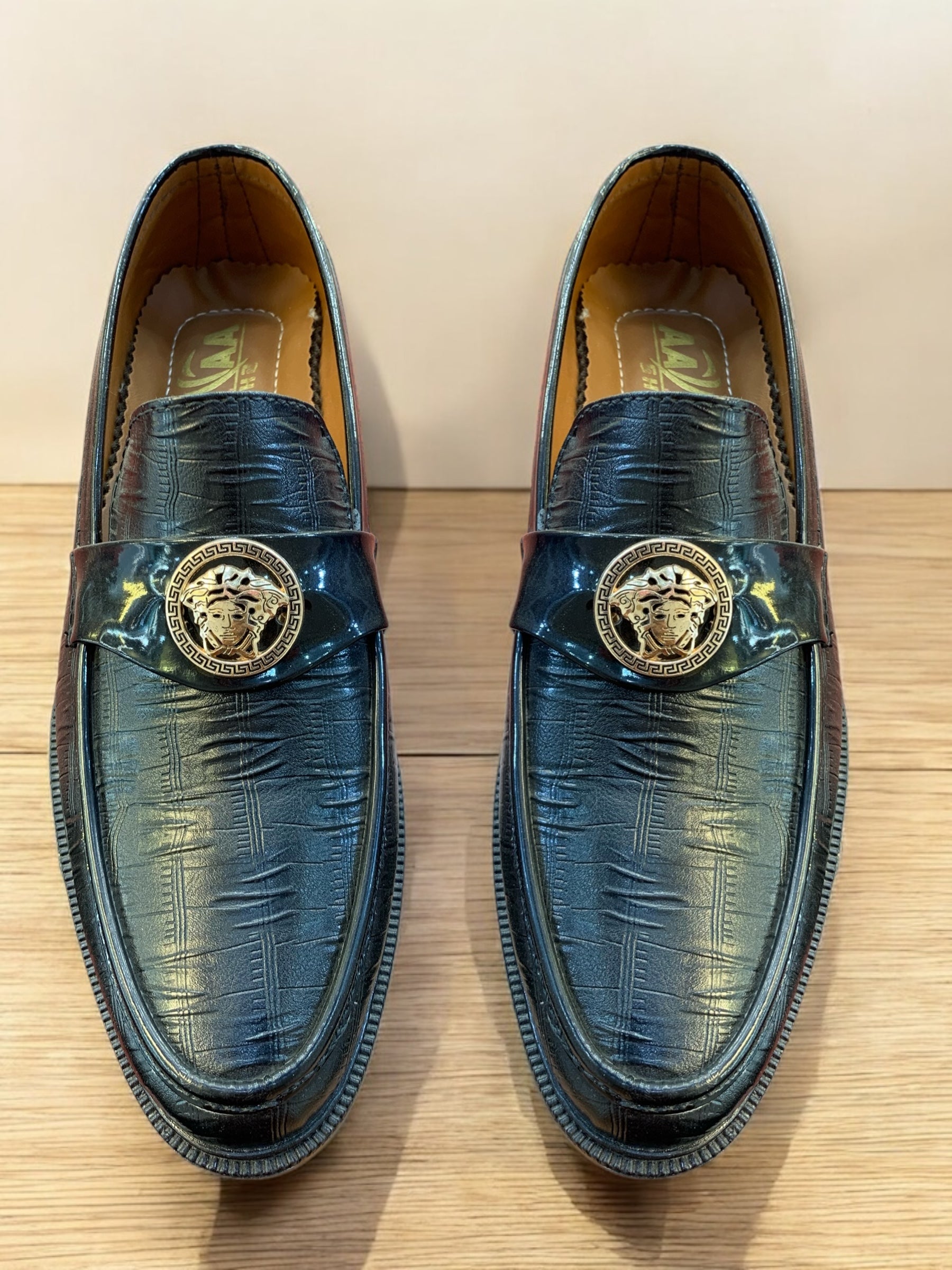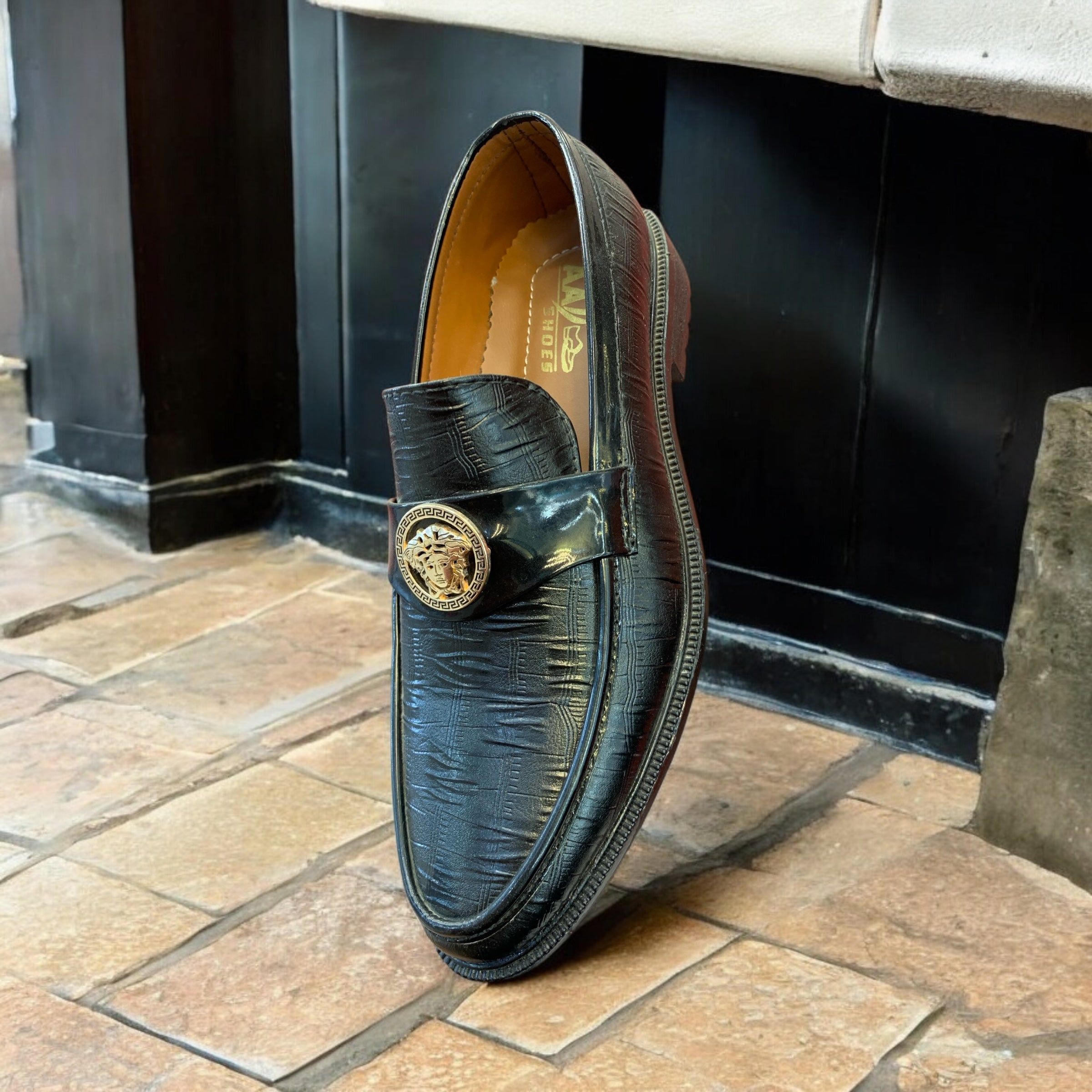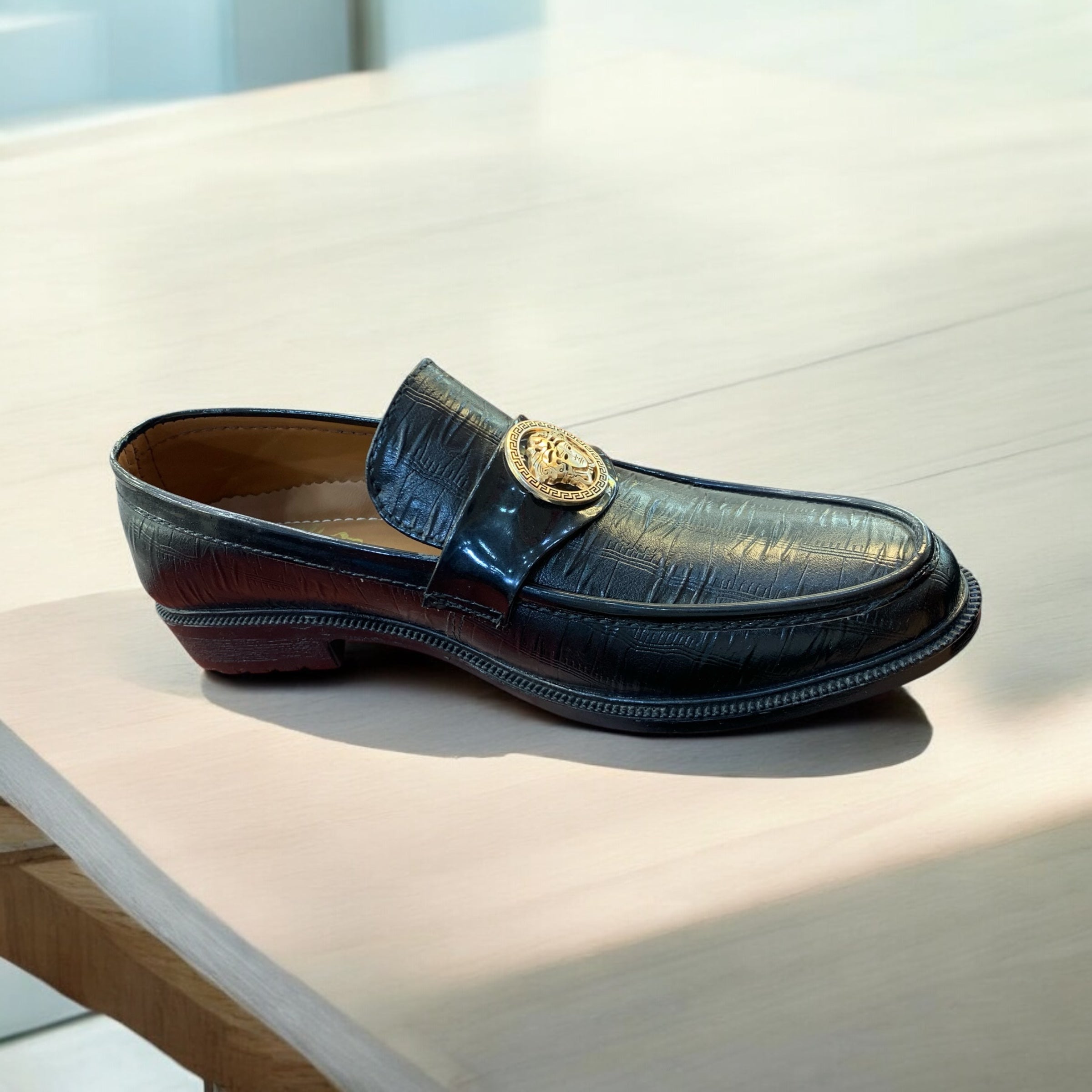 Command attention with the Imperial Crest Bit Loafer, a striking blend of elegance and power. Crafted from premium black textured leather, this loafer radiates refinement, accentuated by its gold lion emblem—a symbol of strength and sophistication. The Greek key design surrounding the crest adds a timeless touch, making this pair an instant statement of prestige.