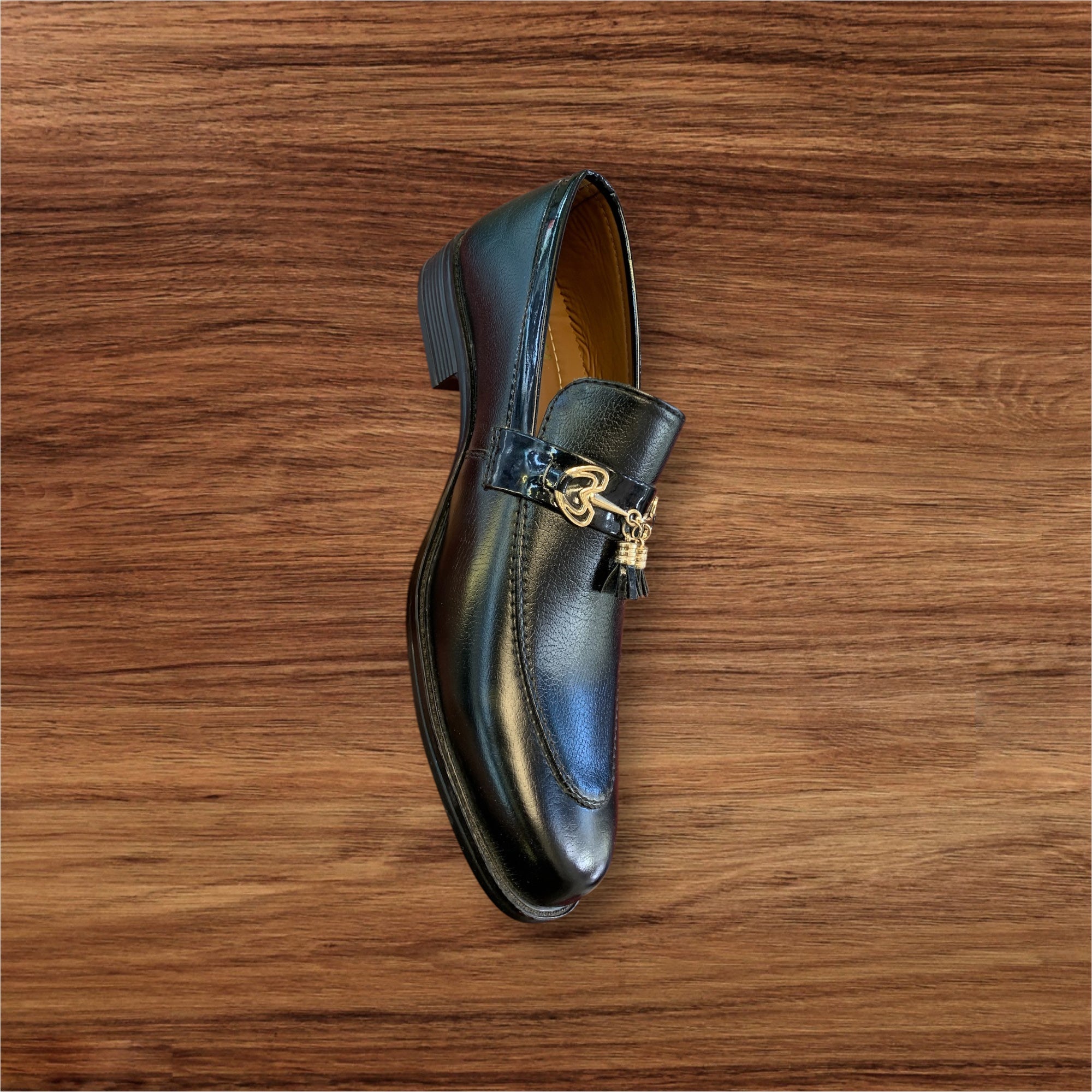 Command attention with the Imperial Crest Loafer – a bold blend of heritage charm and refined luxury. Wrapped in polished midnight black leather with rich oxblood undertones, this loafer features a distinctive gold-tone bit accented by twin tassels, echoing old-world sophistication with a modern twist. The soft inner lining and contoured insole provide unmatched comfort, while the elegant profile ensures a sharp look from formal to semi-casual settings.