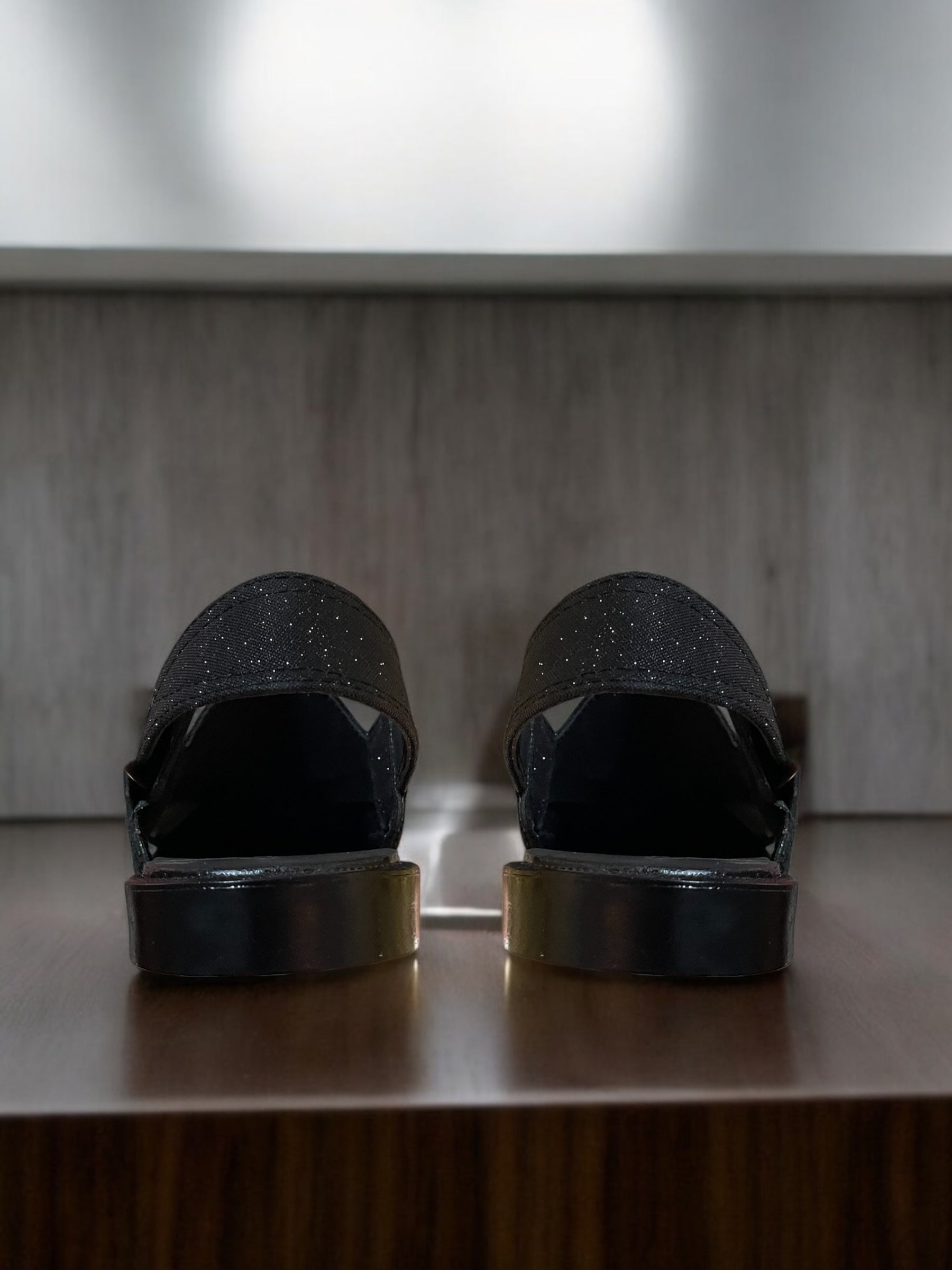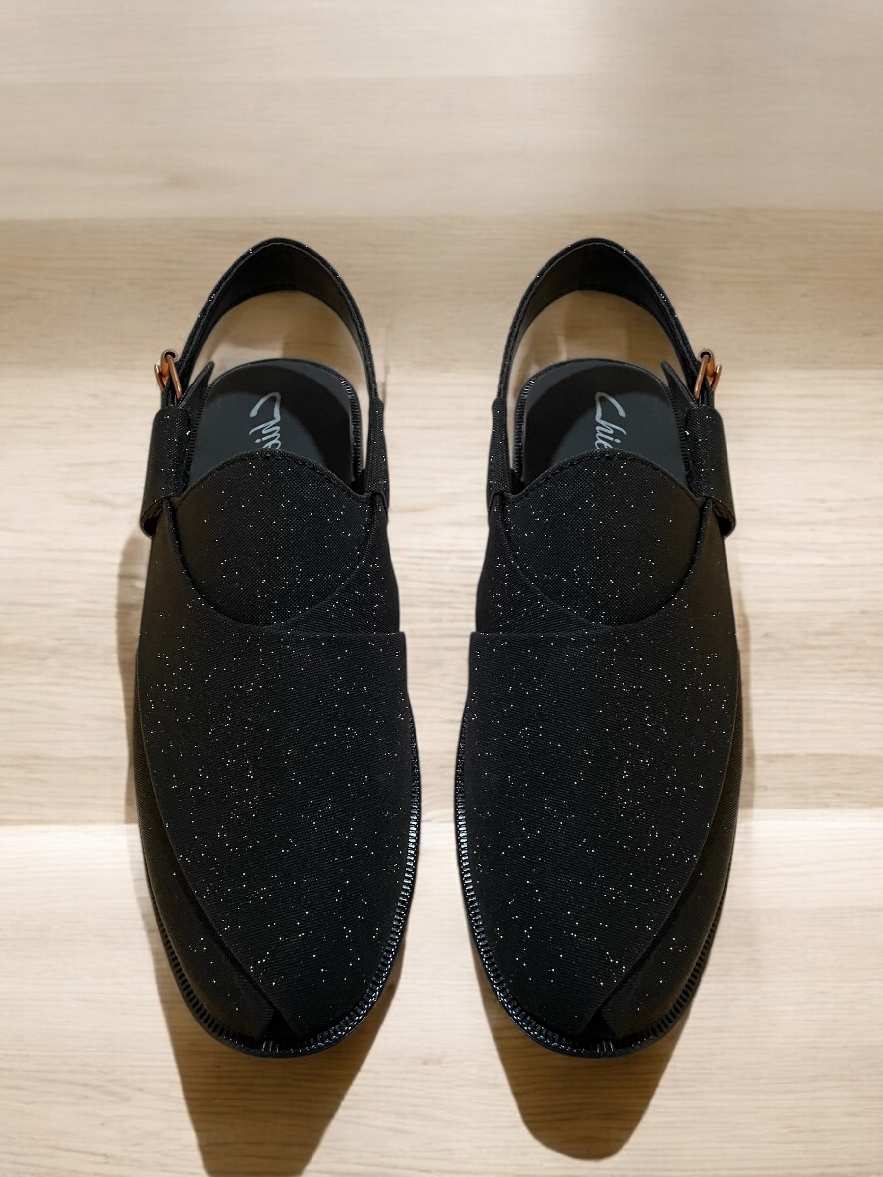 Step into style with the Black Spark Peshawari Chappal by City Shoes. Crafted with a shimmering black fabric and classic double-strap design, it blends tradition with modern flair — perfect for festive and formal wear.